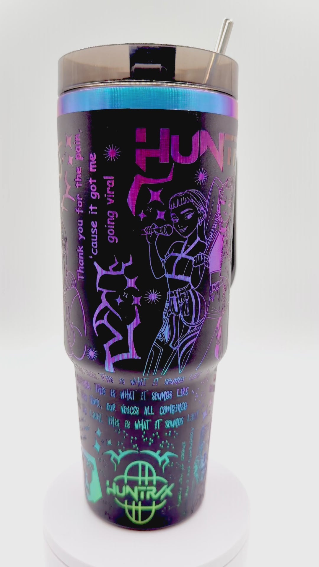Inspired by the hype around KPop Demon Hunters, this tumbler sports a striking rainbow print over a black full-wrap design with an electroplated finish protected beneath a smooth powder coat. Double-wall vacuum insulation keeps drinks hot or cold for hours, while the included handle, tinted lid, and stainless steel straw make sipping easy and portable. Each tumbler includes one engraved spot—perfect for branded swag or personal customization—and arrives boxed and BPA-free for gifting.