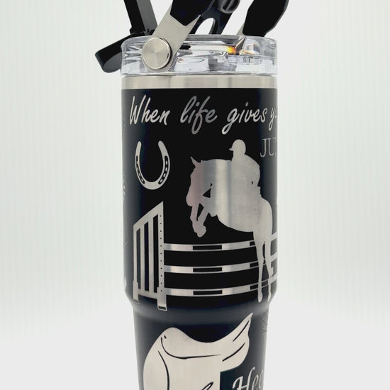 EtchWorkX LLC brings you the Keep Calm & Ride On 30oz Full Wrap Tumbler — a roomy, customizable tumbler built for riders, commuters, and anyone who likes their drink exactly how they want it. Double-wall vacuum insulation keeps beverages hot or cold for hours, while the tri-sip lid lets you drink from the wide opening, use a straw, or flip down the built-in straw for fuss-free sipping on the go. The black powder-coated exterior is a perfect full-wrap canvas for your custom design, and each tumbler ships individually boxed — great for gifts or resale. Want something unique or ordering in bulk? Chat with us or email info@etchworkx.com to bring your idea to life and learn about discounts on orders of 10 or more.